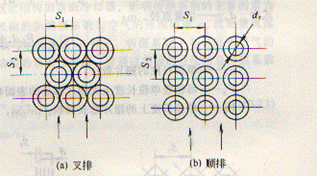 在一個(gè)管束中,翅片管排列方式的選取是致關(guān)重要的。有兩種排列方式:順排和叉排。如下圖所示: