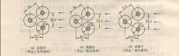 對(duì)于叉排管束,經(jīng)常采用等邊三角形排列,又時(shí)也采用等腰三角形排列,下圖所示的是在翅片管散熱器上所應(yīng)用的幾種等邊三角形排列的尺寸規(guī)格。