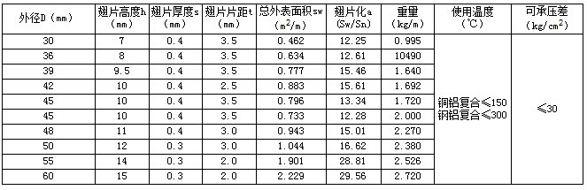 四、鋼鋁復(fù)合翅片管規(guī)格性能表: